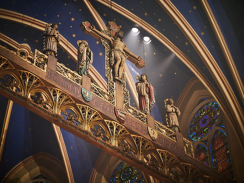 "Behold the Lamb of God" The Rood Beam at Saint Mary's (1912) by Johannes Kirchmayer (1860-1930), gift of Florence I. Jones, in memory of her brother, William Edward Jones. This is the first work of Kirchmayer's to be commissioned for Saint Mary's.