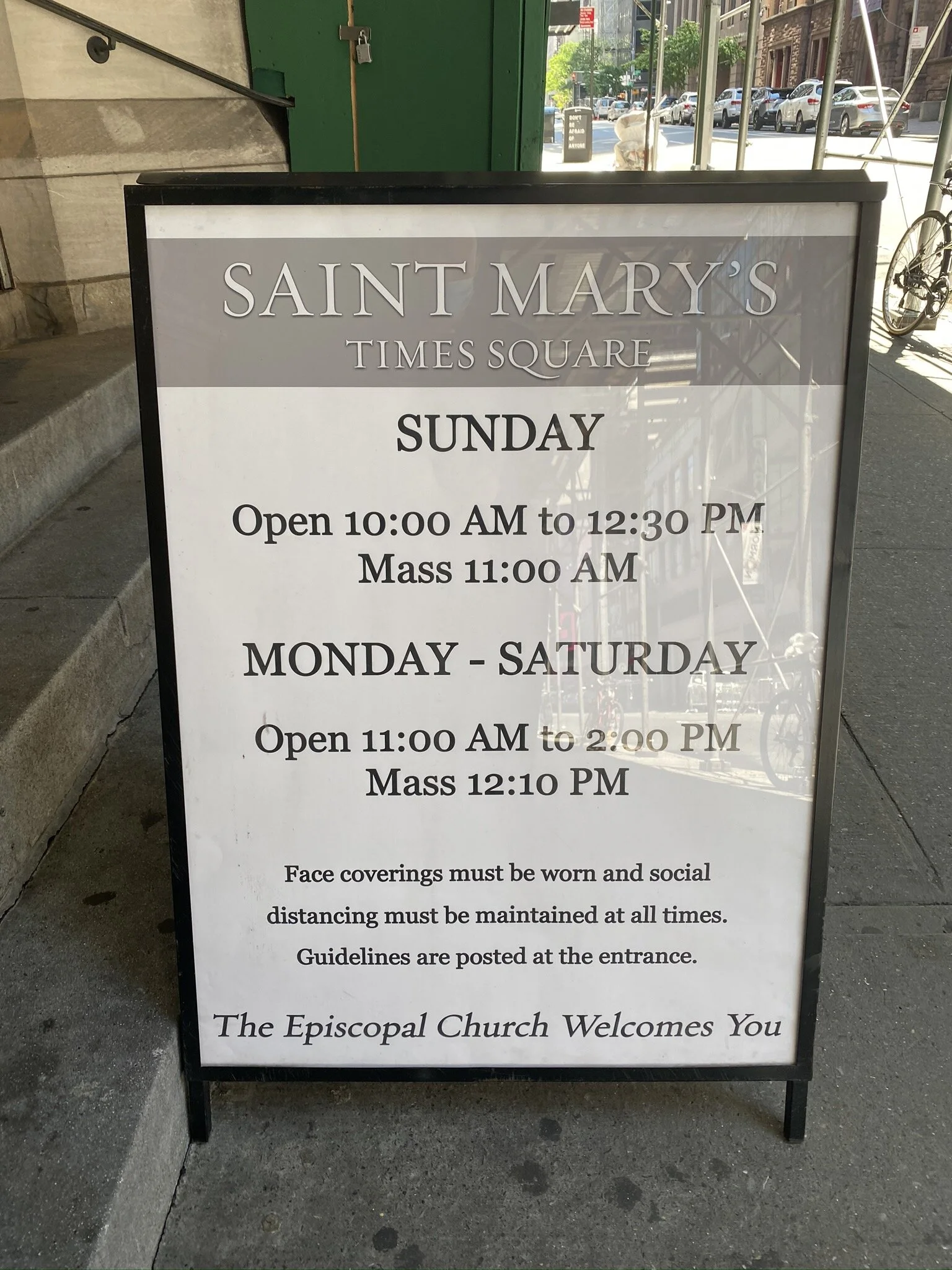 Other things. The Board of Trustees has begun the serious work of redrafting the budget for the remaining months of this year. There are so many unknowns at this point in time. But significant cuts must be made. Our income depends, among other things, on our buildings being used, not only for worship and prayer, but for the many support groups and other non-profit organizations who meet here. We are glad that the New York Repertory Orchestra and the Young New Yorkers’ Chorus rehearse here. Like the rest of Broadway, our resident theater group, Royal Family Productions, Inc., is closed too. There has been no outside use of the church since Saturday, March 14. Saint Mary’s has been from the beginning a place for people to pray whenever the church is open. That support from donations will return when business, entertainment, and visitors return to Times Square. In the meantime, we are actively exploring the ways in which we can maintain our witness and ministry. Our plan to reopen is firmly in place. That plan continues to evolve as we gain further information.