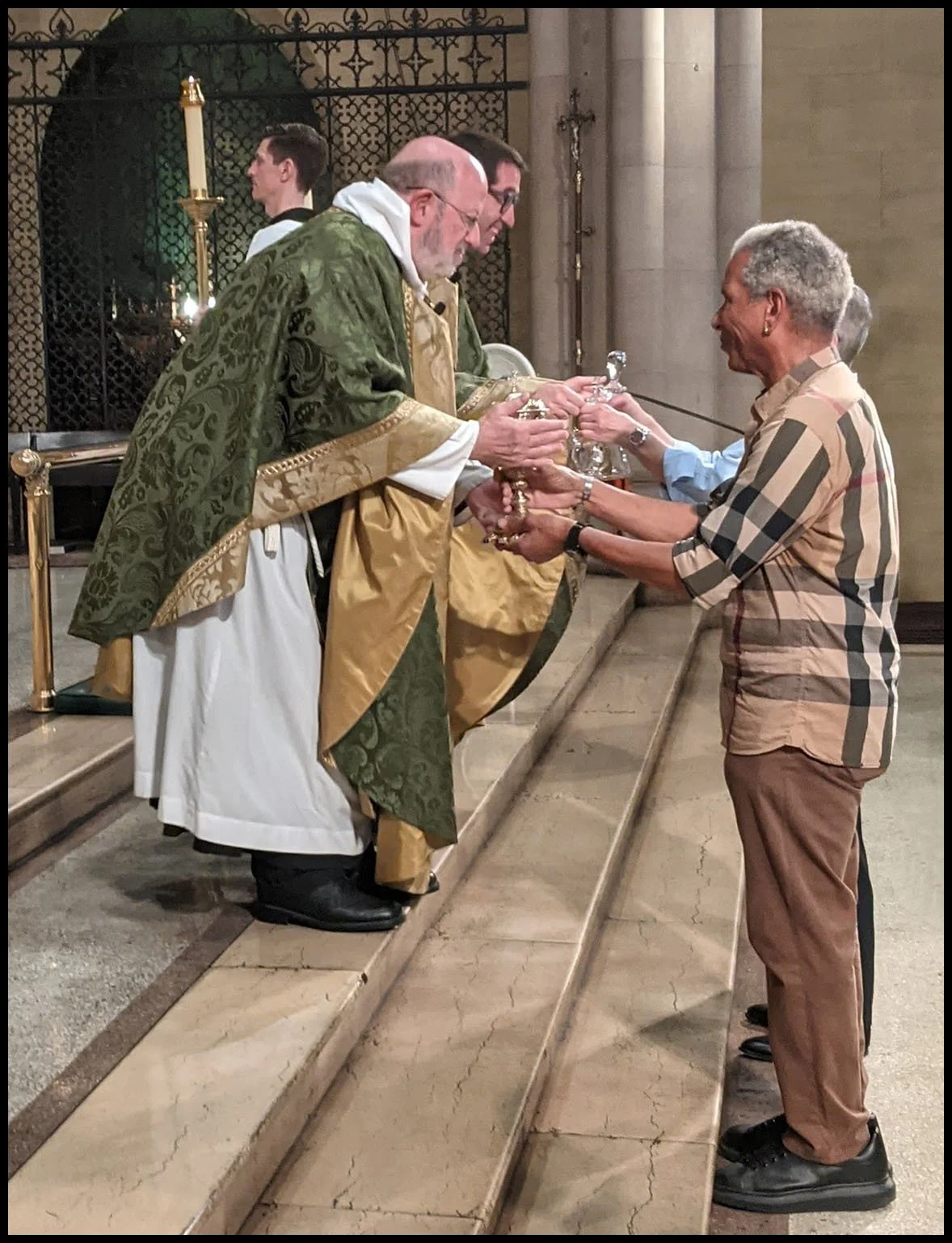 Good friends of the parish, Mr. Winston Deane and Father Anthony Jones, brought forward the gifts of bread and wine at Solemn Mass.