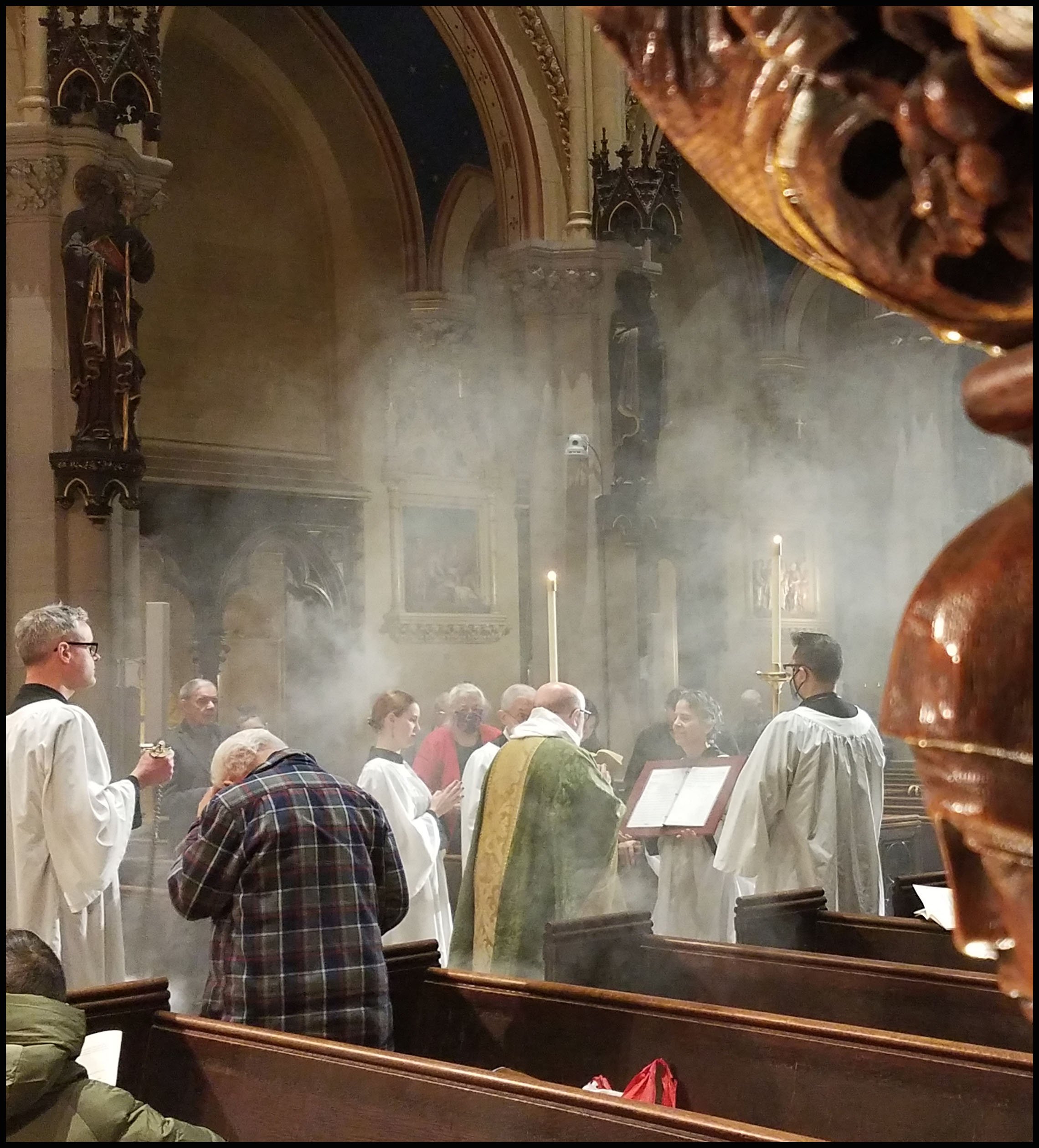 Father Jay Smith chanted the Gospel Lesson on Sunday. Mrs. Grace Mudd was the MC. Dr. Leroy Sharer and Mr. Rick Miranda served as the acolytes. Ms. Pat Ahearn, holding the Gospel Book, was the crucifer. Mr. Clark Mitchell served as the thurifer.