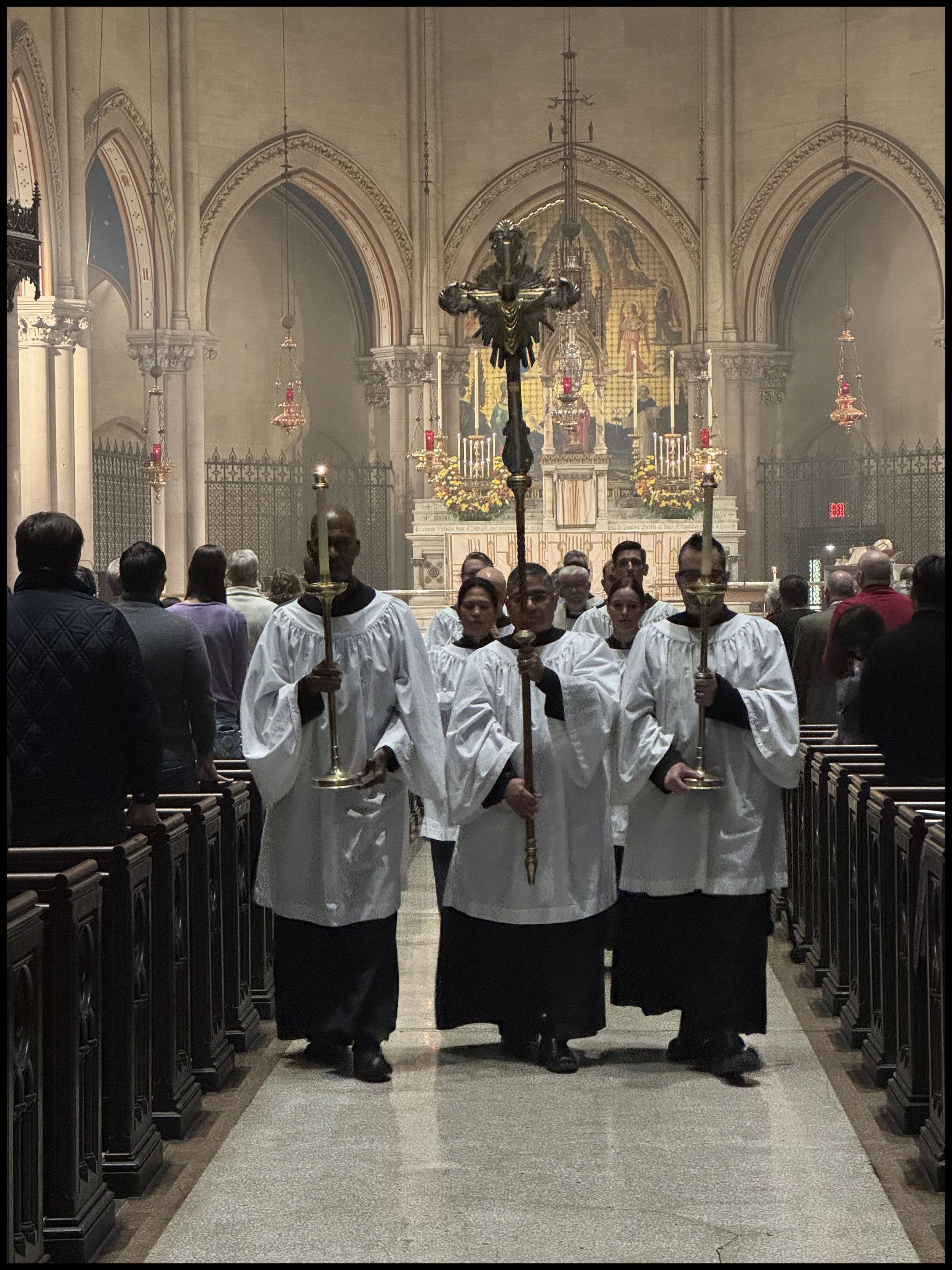 The procession on Christ the King gets underway and is led by Mr. David Falatok, who served as the thurifer. Mr. Clark Mitchell was the MC. Mr. Luis Reyes served as the crucifer. Mr. Rick Miranda and Mr. Charles Carson were the acolytes. Mr. Brendon Hunter carried one of the banners and is flanked by Mrs. Grace Mudd and Mr. Santiago Puigbo, who were carrying torches. Mr. Andrew Fairweather carried the other banner. Mrs. Dianne Gonzales Grindley, in choir, was also one of the torch bearers at Solemn Mass.