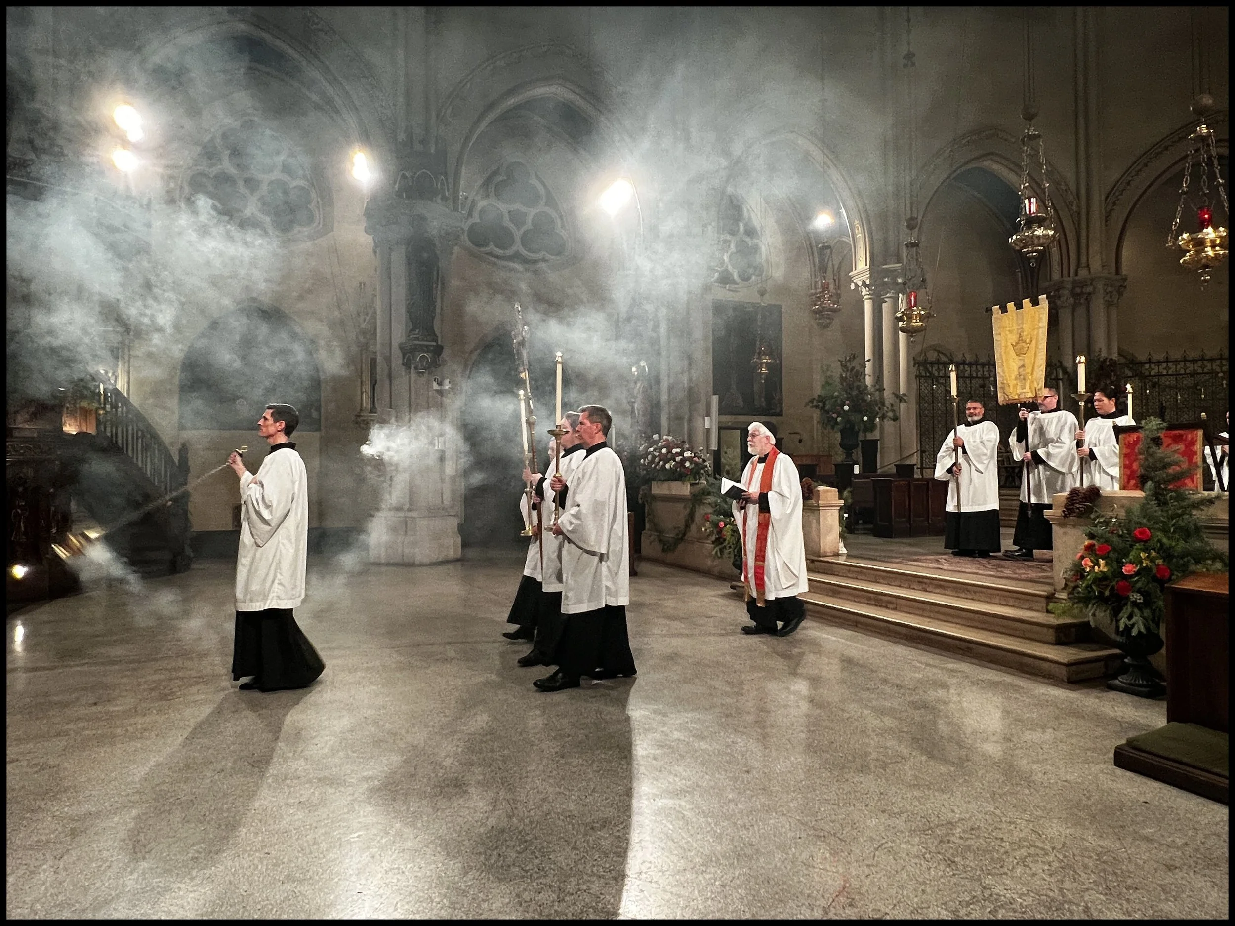 On the Epiphany of Our Lord Jesus Christ, Mr. Brendon Hunter was the thurifer and led the procession. Mr. David Falatok was the crucifer. Ms. MaryJane Boland and Dr. Mark Risinger served as the acolytes. Fr. Stephen Morris assisted at Solemn Mass. Mr. Rick Miranda carried the banner in procession, flanked by torch bearers Mr. Luis Reyes and Mrs. Dianne Gonzales Grindley. Click on any photo to enlarge.