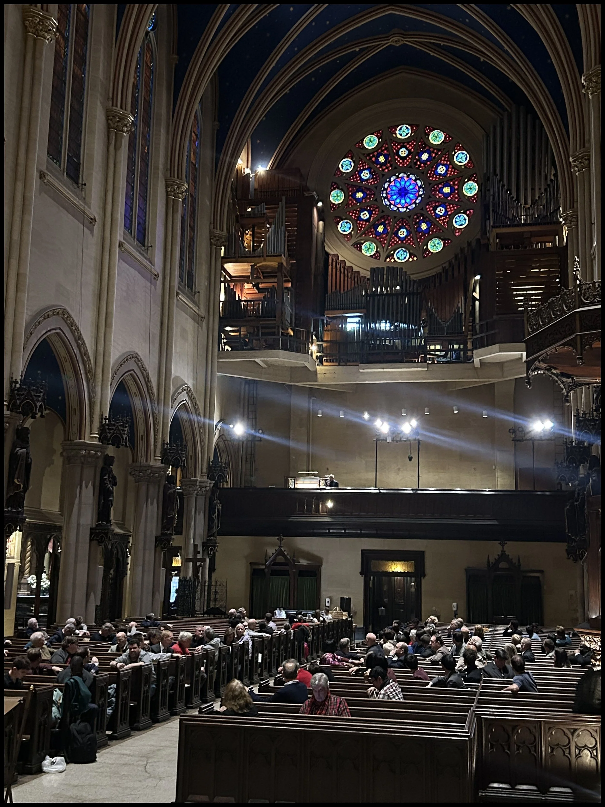 The communion motet is Hear my prayer, a setting, mostly in four parts, of a portion of Psalm 102 by Canadian composer Stephanie Martin (b.1962). Stephanie Martin is Professor Emeritus and Senior Scholar of music at York University’s School of the Arts, Media, Performance, and Design. For the 2025-26 season she is composer-in-residence for the Toronto Mendelssohn Choir. She directs Schola Magdalena, a women’s ensemble, is conductor emeritus of Pax Christi Chorale, and past director of music at the historic church of Saint Mary Magdalene in Toronto where Healey Willian had serviced from 1921 until 1968. Stephanie Martin’s motet Hear my prayer begins begins in neo-polyphonic style with individual voice entries and proceeds in conventional fashion in the tonal orbit of B minor. It’s final reassuring section, verse twelve of the psalm, transitions to the brighter tonality of B Major.
