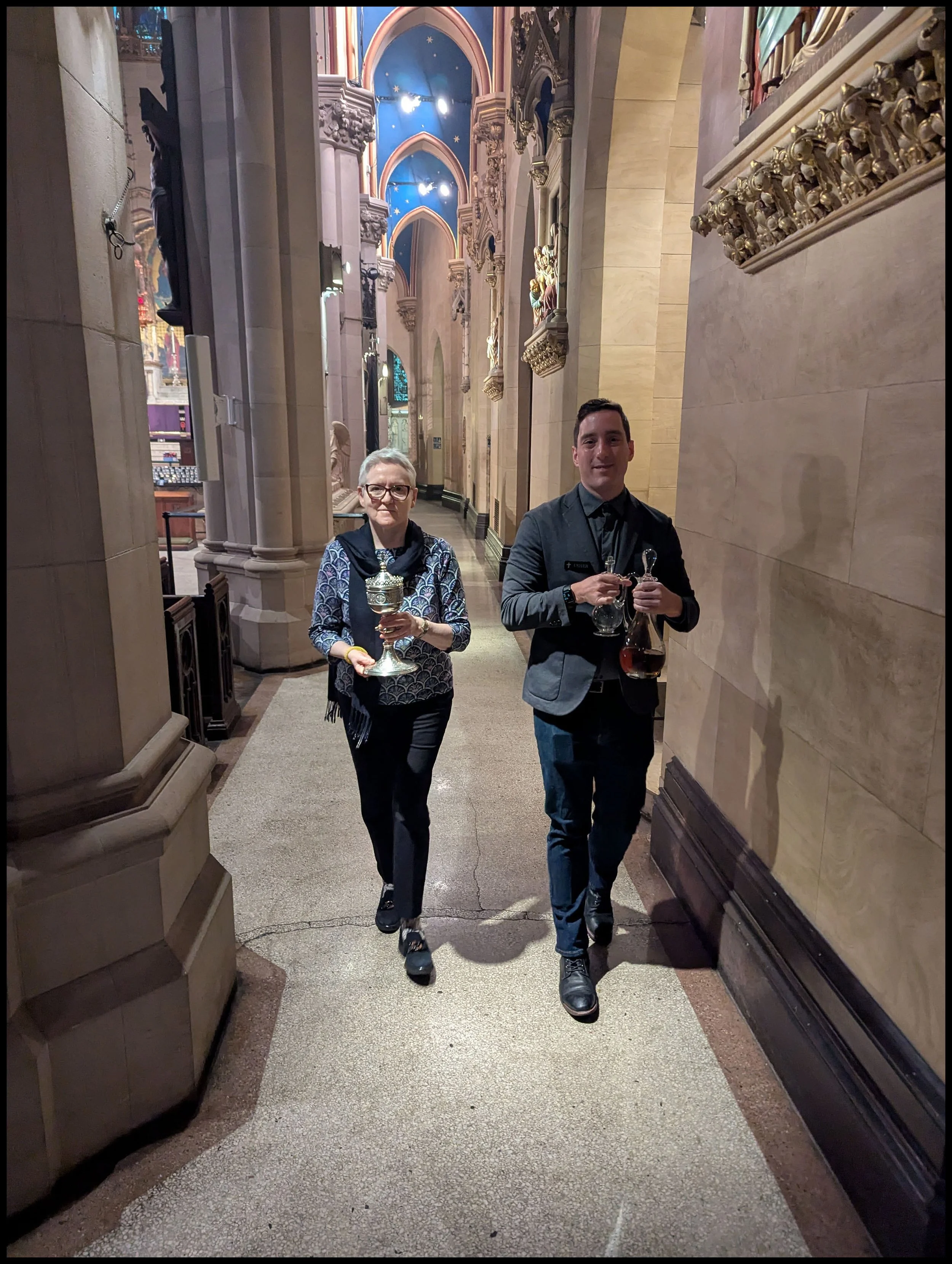 Ms. Marie Rosseels and Mr. Sam Stubblefield served as ushers last Sunday and are getting the bread, wine, and water from the Sacred Heart Shrine for the offertory procession.